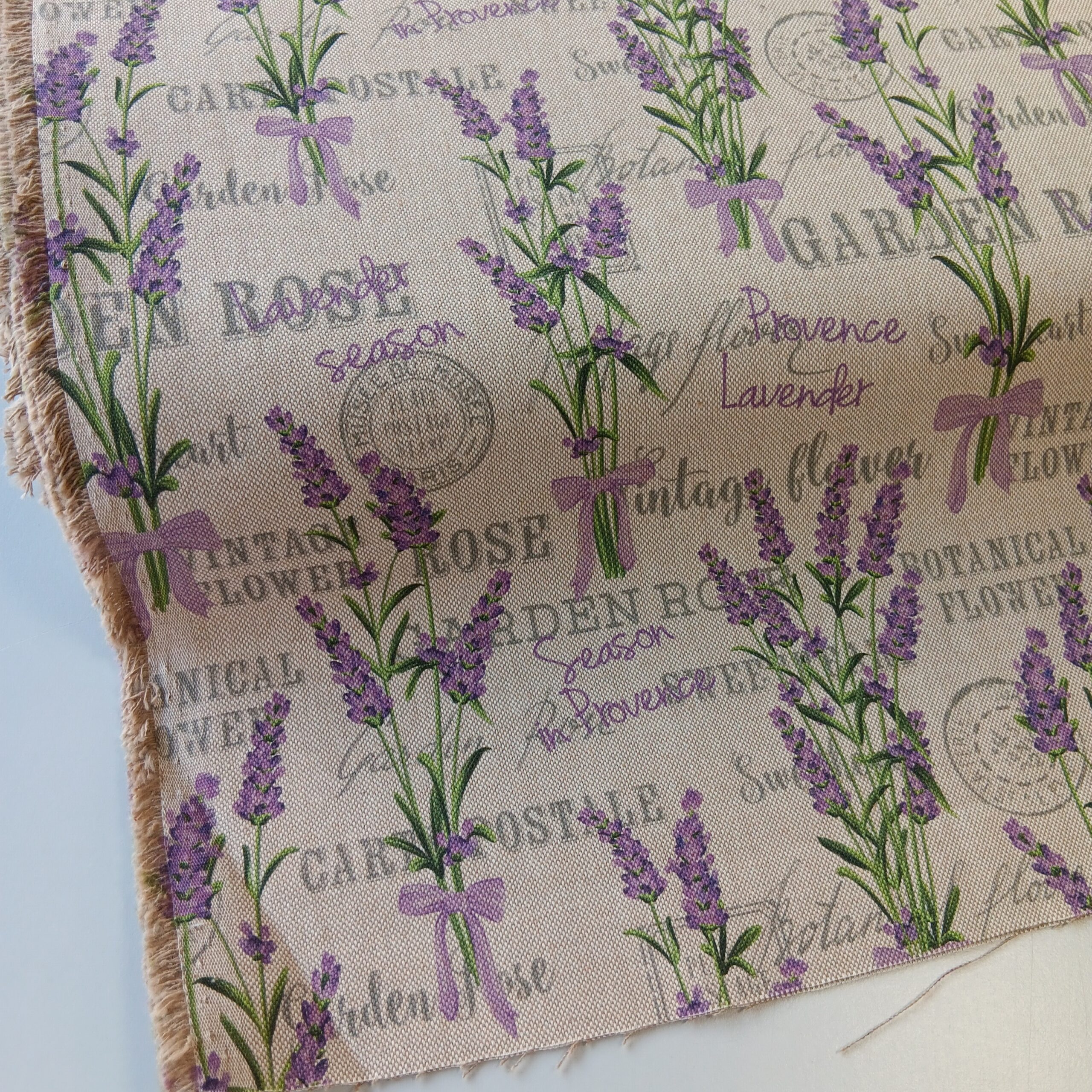 Een leuke decoratiestof in linnenlook. Beige ondergrond met tekst en lavendelmotief.